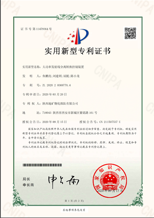 ??? 近日,物化探隊申請的《大功率地面電磁法測量系統》與《大功率發射線分離轉換控制裝置》兩項實用新型專利,獲得國家知識產權局頒發的專利證書。